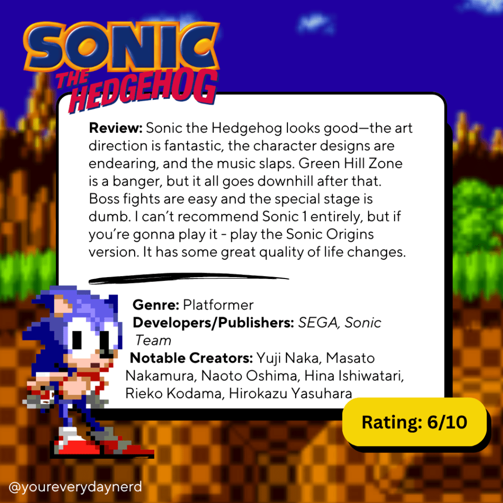 I can’t recommend Sonic the Hedgehog. My friend Aden said it best “it’s a great proof of concept”. For a franchise with so many ups and downs, it’s kind of insane that it also has a rough start. Even so, my curiosity in this series is still fairly strong right now.